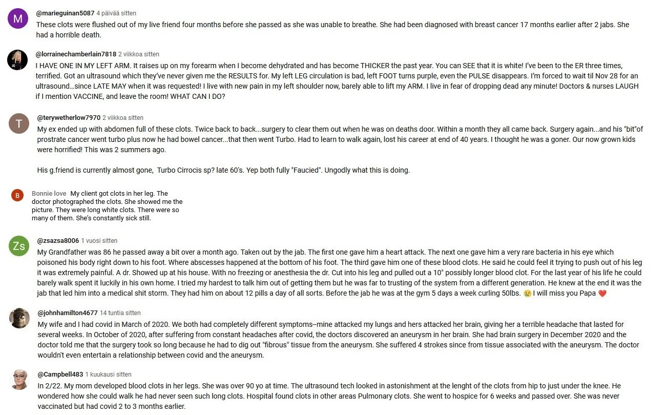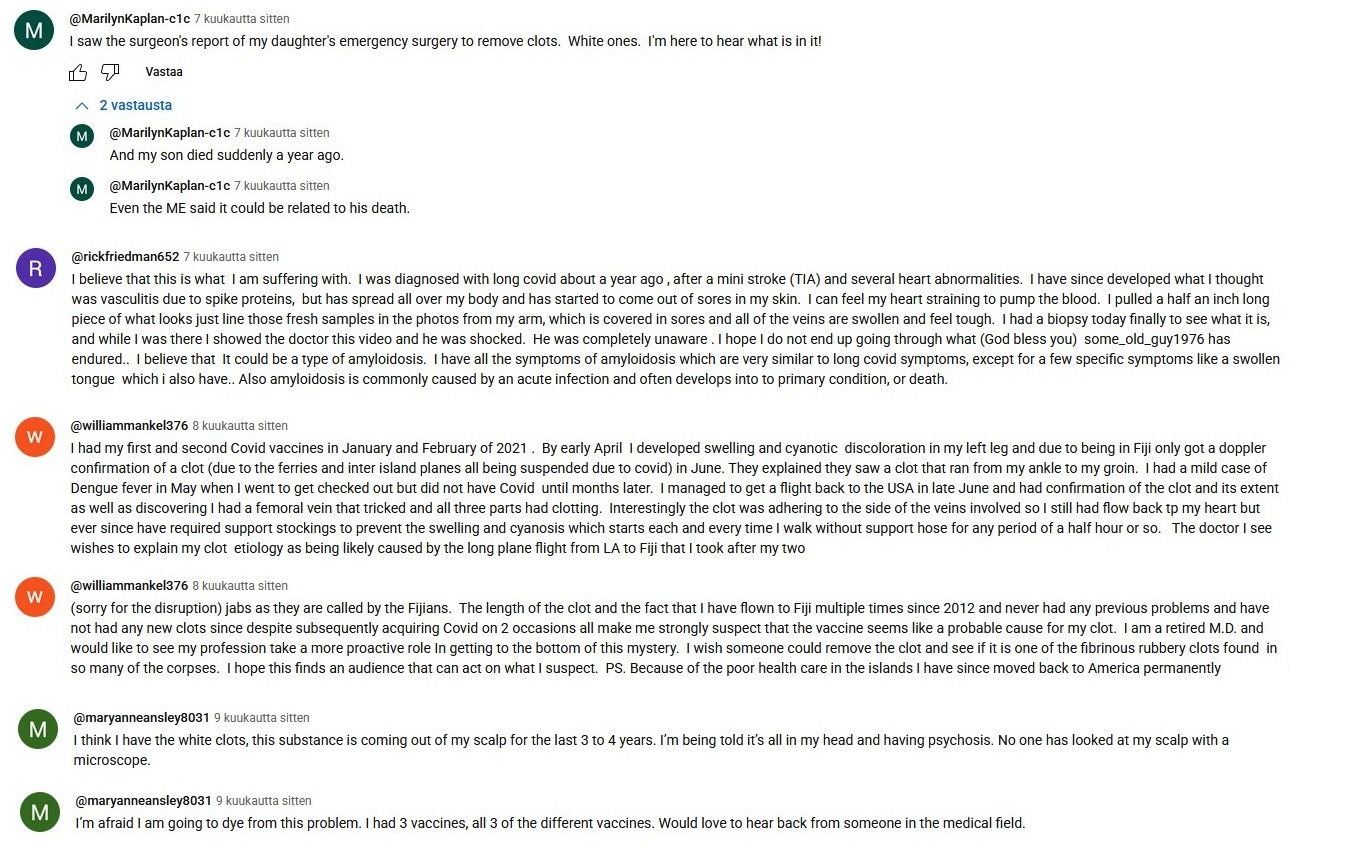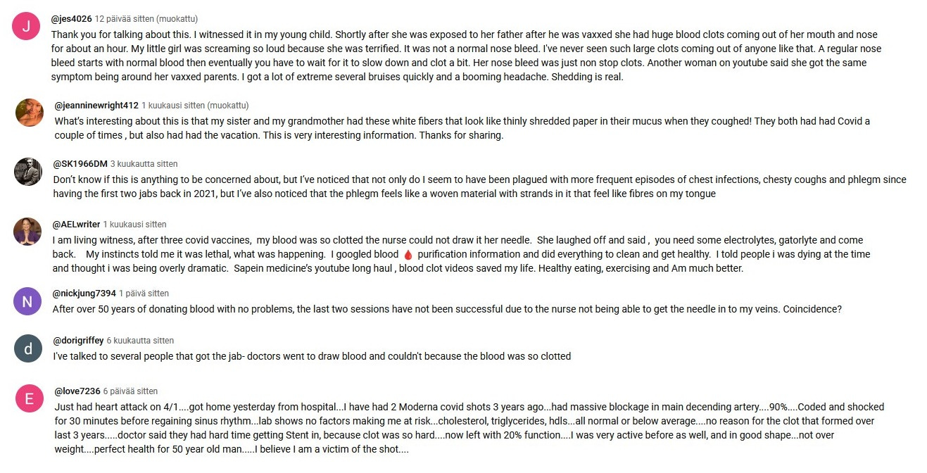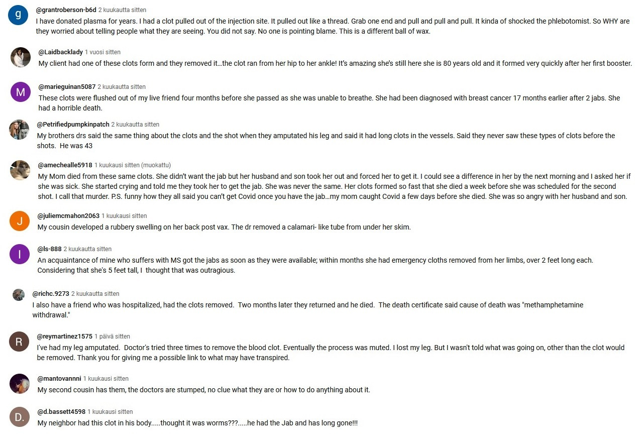Since the end of the year 2023 I have been taking screenshots from Youtube comments that deal with the white fibrous clots and other covid vaccine side effects.