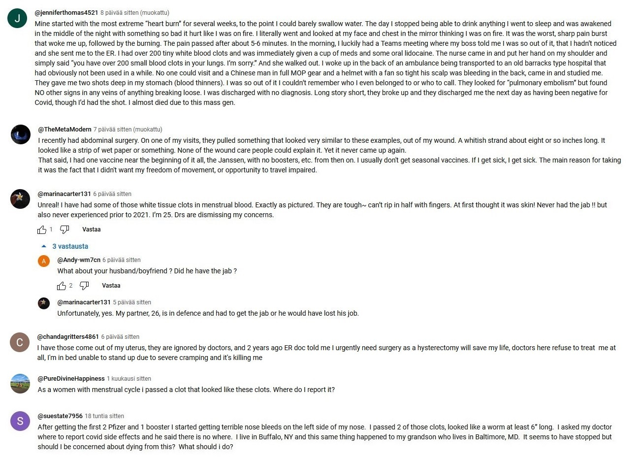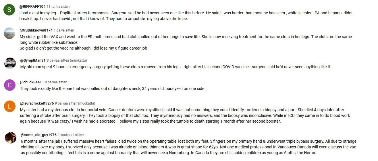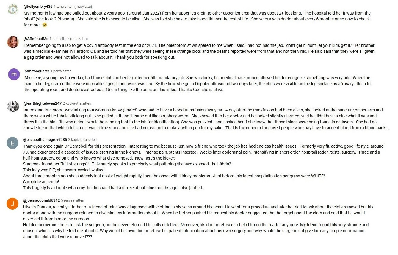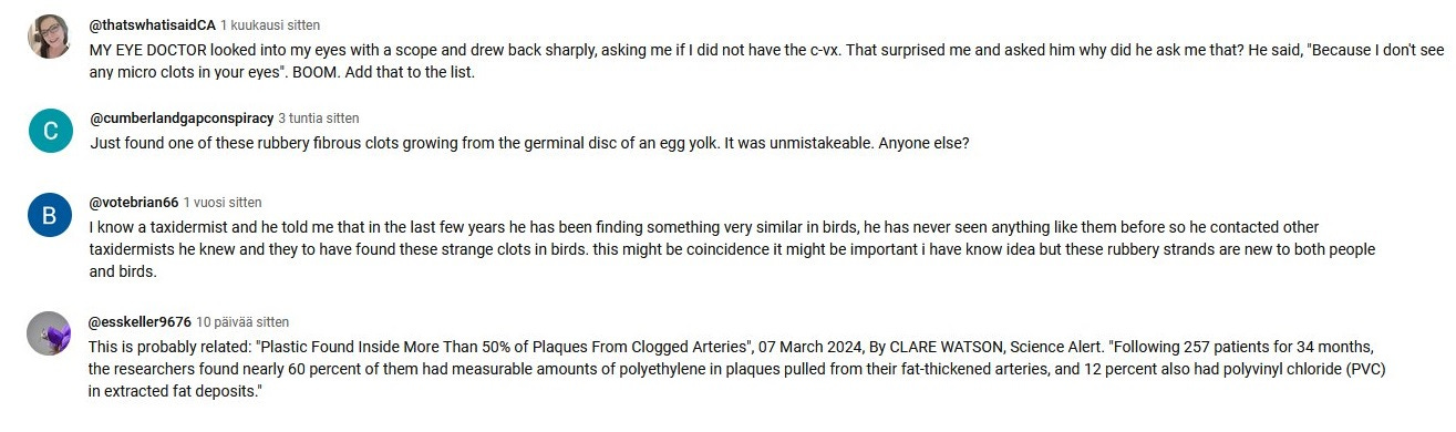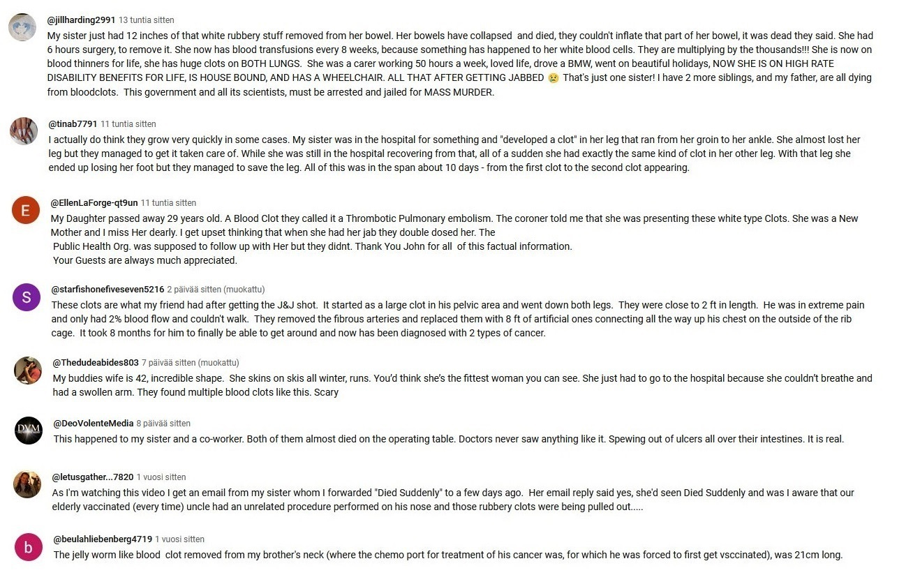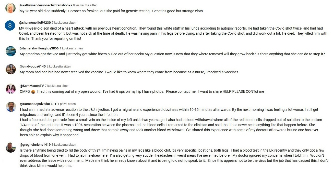 Since the end of the year 2023 I have been taking screenshots from Youtube comments that deal with the white fibrous clots and other covid vaccine side effects.