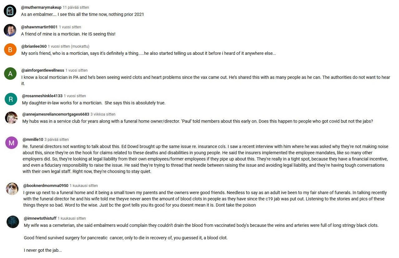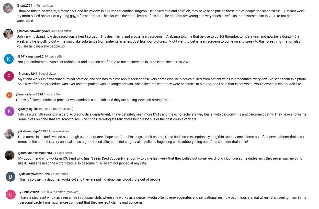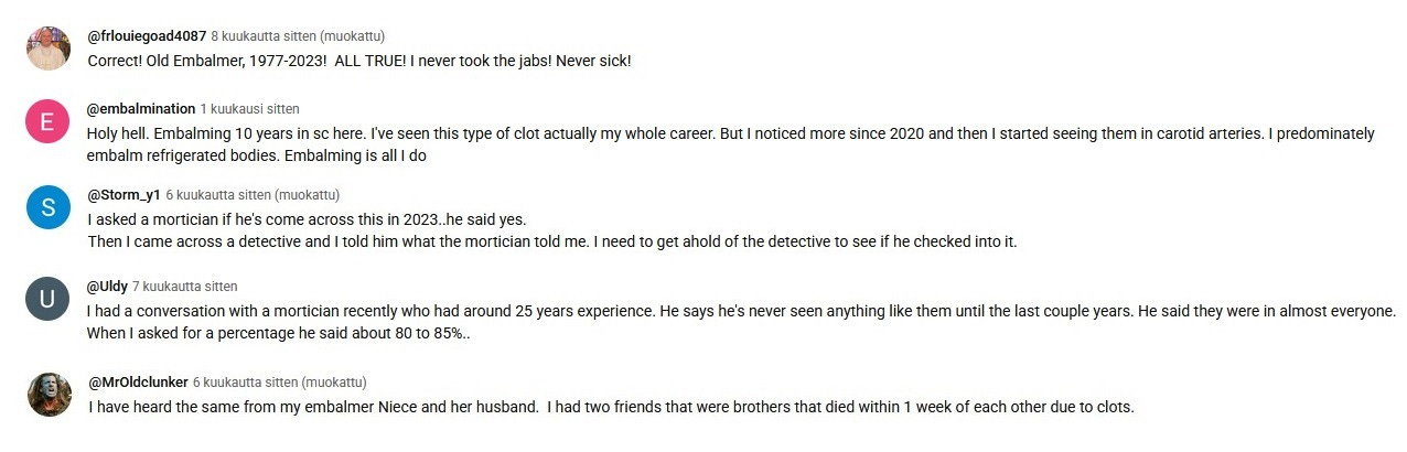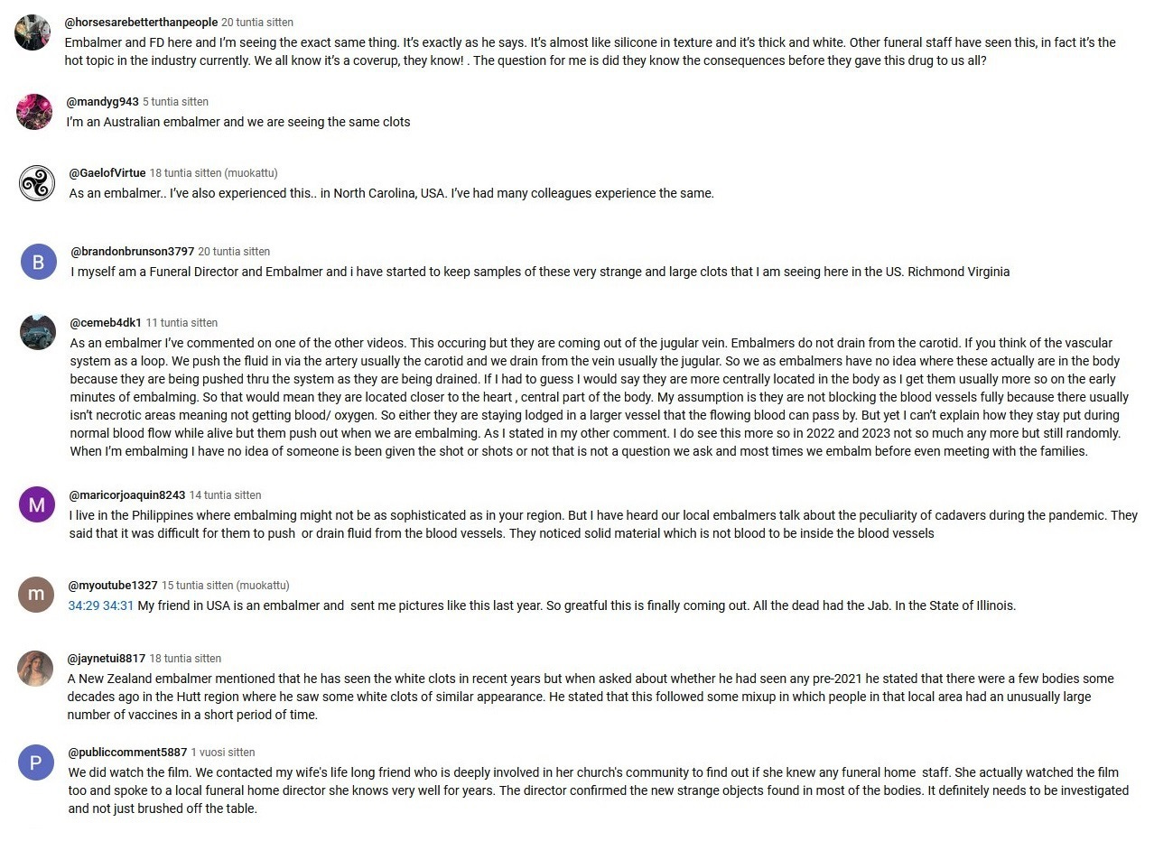 Fantastic article, Vesa! Thank you. In addition to all of the comments from embalmers, hospital staff, and ordinary people that you have so well consolidated in this article, I have hundreds of very similar comments from embalmers, hospital staff, and ordinary people as well who have responded to either my three 2022, 2023, and 2024 "Worldwide Embalmer Blood Clot Surveys" or my "2024 People's Blood Clot Survey." These WHITE FIBROUS CLOTS are happening on a grand scale, and they are killing and injuring a lot of people with strokes and heart attacks!