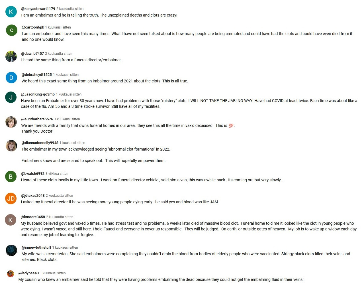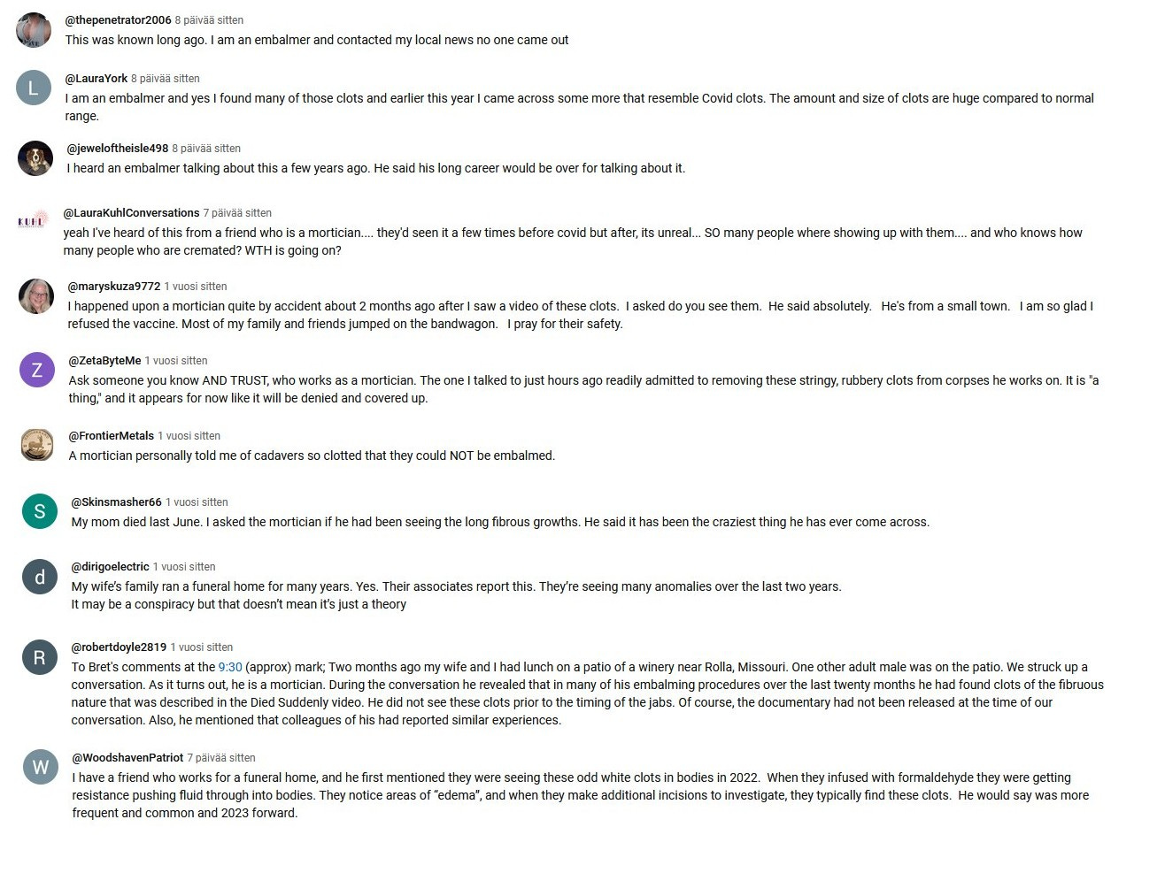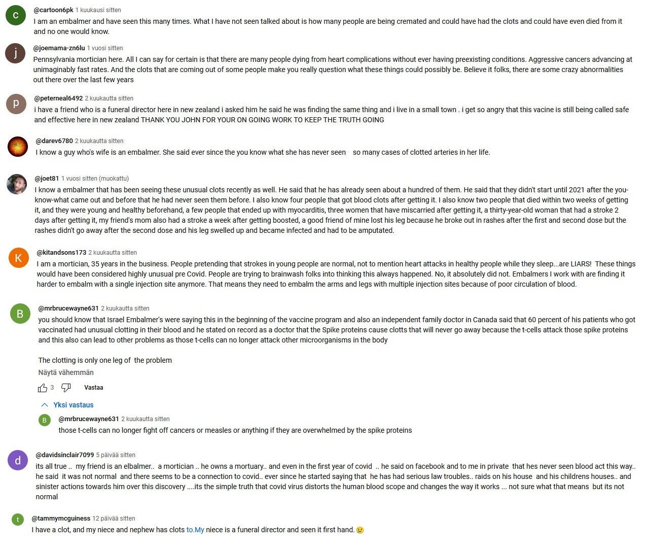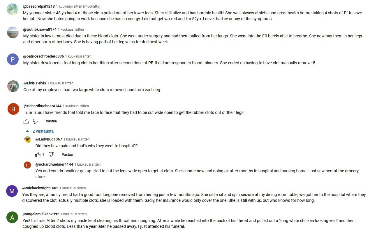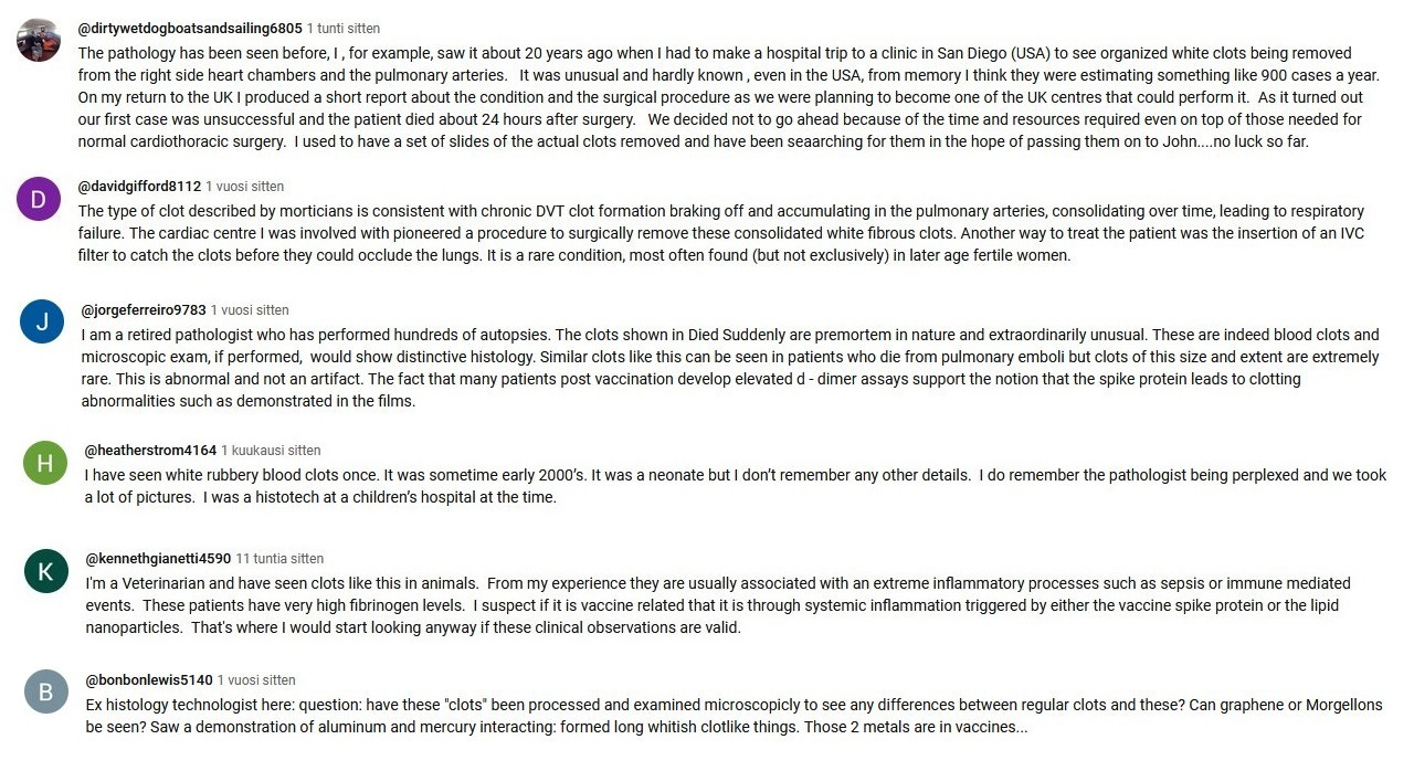 This here is PART 1 of my Youtube comment collection. These first 150 comments mainly deal with the embalmers clots phenomenon. The second part will be posted later, and that will deal with cancer, heart problems and other topics.